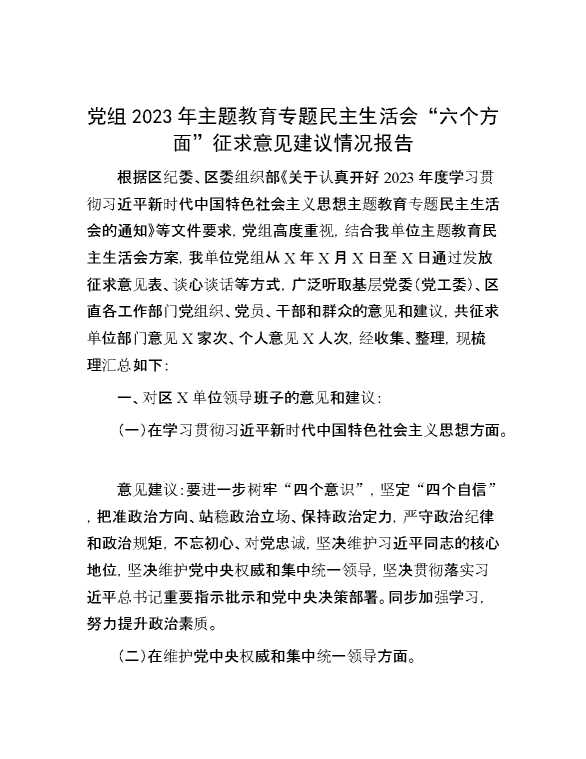 党组2023年主题教育专题民主生活会“六个方面”征求意见建议情况报告【23788】 2024-01-11 Word模板 141 购买前,请一定要先点击这里看看,欢迎持续关注,精彩模板每天推送 预览结束,本文件为word文档,一共4页,共1421字,请购买后,下载后查看 购买前,请一定要先点击这里看看,欢迎持续关注,精彩模板每天推送 资源下载下载价格29 RMBVIP免费升级VIP点击检测网盘有效后购买有任何充值和下载问题请加微信:xuexixuexi66 0 党课及生活会