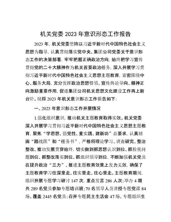 机关党委2023年意识形态工作报告 2024-01-11 Word模板 120 购买前,请一定要先点击这里看看,欢迎持续关注,精彩模板每天推送 预览结束,本文件为word文档,一共6页,共2991字,请购买后,下载后查看 购买前,请一定要先点击这里看看,欢迎持续关注,精彩模板每天推送 资源下载下载价格29 RMBVIP免费升级VIP点击检测网盘有效后购买有任何充值和下载问题请加微信:xuexixuexi66 0 总结汇报