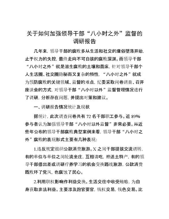 关于如何加强领导干部“八小时之外”监督的调研报告 2024-01-15 Word模板 107 购买前,请一定要先点击这里看看,欢迎持续关注,精彩模板每天推送 预览结束,本文件为word文档,一共6页,共2787字,请购买后,下载后查看 购买前,请一定要先点击这里看看,欢迎持续关注,精彩模板每天推送 资源下载下载价格29 RMBVIP免费升级VIP点击检测网盘有效后购买有任何充值和下载问题请加微信:xuexixuexi66 0 总结汇报