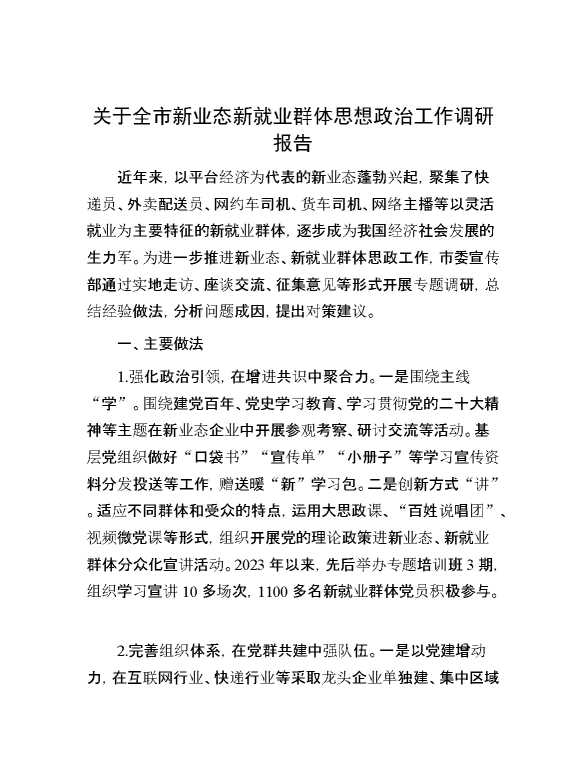 关于全市新业态新就业群体思想政治工作调研报告 2024-01-15 Word模板 102 购买前,请一定要先点击这里看看,欢迎持续关注,精彩模板每天推送 预览结束,本文件为word文档,一共6页,共2491字,请购买后,下载后查看 购买前,请一定要先点击这里看看,欢迎持续关注,精彩模板每天推送 资源下载下载价格29 RMBVIP免费升级VIP点击检测网盘有效后购买有任何充值和下载问题请加微信:xuexixuexi66 0 总结汇报