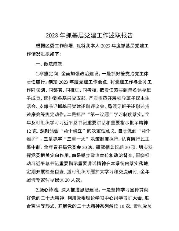 2023年抓基层党建工作述职报告 2024-01-15 Word模板 108 购买前,请一定要先点击这里看看,欢迎持续关注,精彩模板每天推送 预览结束,本文件为word文档,一共5页,共2339字,请购买后,下载后查看 购买前,请一定要先点击这里看看,欢迎持续关注,精彩模板每天推送 资源下载下载价格29 RMBVIP免费升级VIP点击检测网盘有效后购买有任何充值和下载问题请加微信:xuexixuexi66 0 总结汇报