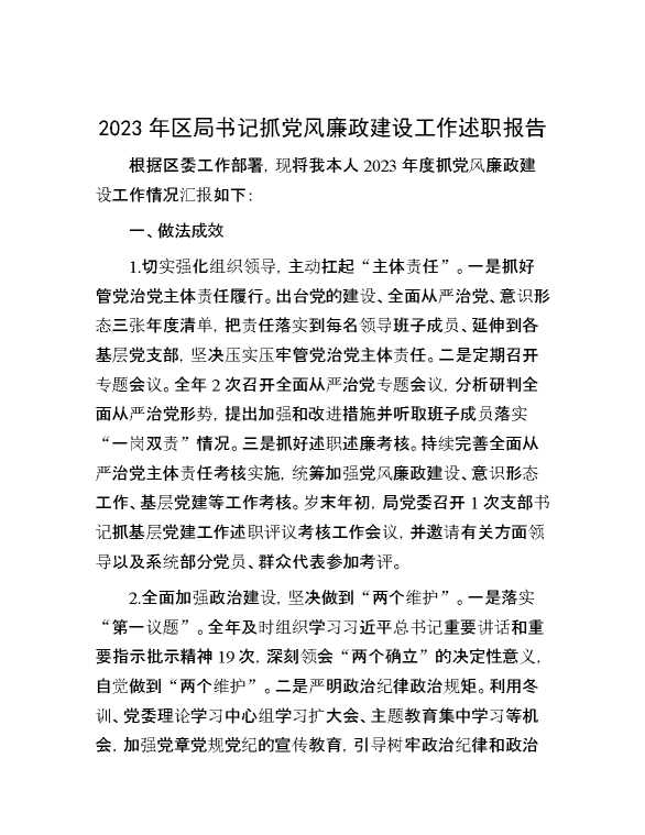 2023年区局书记抓党风廉政建设工作述职报告 2024-01-15 Word模板 110 购买前,请一定要先点击这里看看,欢迎持续关注,精彩模板每天推送 预览结束,本文件为word文档,一共5页,共1904字,请购买后,下载后查看 购买前,请一定要先点击这里看看,欢迎持续关注,精彩模板每天推送 资源下载下载价格29 RMBVIP免费升级VIP点击检测网盘有效后购买有任何充值和下载问题请加微信:xuexixuexi66 0 总结汇报
