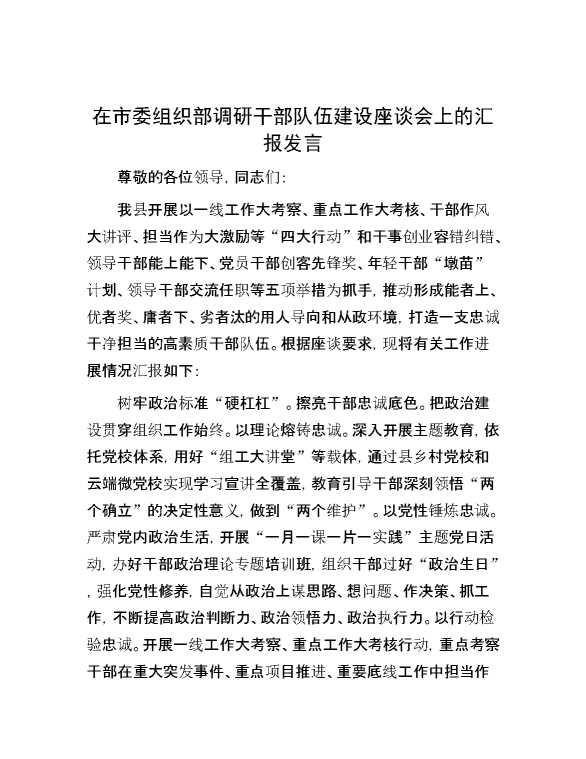 在市委组织部调研干部队伍建设座谈会上的汇报发言 2024-01-15 Word模板 108 购买前,请一定要先点击这里看看,欢迎持续关注,精彩模板每天推送 预览结束,本文件为word文档,一共4页,共1852字,请购买后,下载后查看 购买前,请一定要先点击这里看看,欢迎持续关注,精彩模板每天推送 资源下载下载价格29 RMBVIP免费升级VIP点击检测网盘有效后购买有任何充值和下载问题请加微信:xuexixuexi66 0 演讲发言