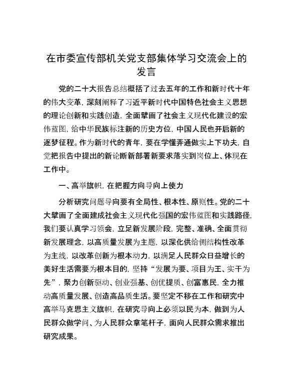 在市委宣传部机关党支部集体学习交流会上的发言 2024-01-15 Word模板 99 购买前,请一定要先点击这里看看,欢迎持续关注,精彩模板每天推送 预览结束,本文件为word文档,一共5页,共2308字,请购买后,下载后查看 购买前,请一定要先点击这里看看,欢迎持续关注,精彩模板每天推送 资源下载下载价格29 RMBVIP免费升级VIP点击检测网盘有效后购买有任何充值和下载问题请加微信:xuexixuexi66 0 演讲发言
