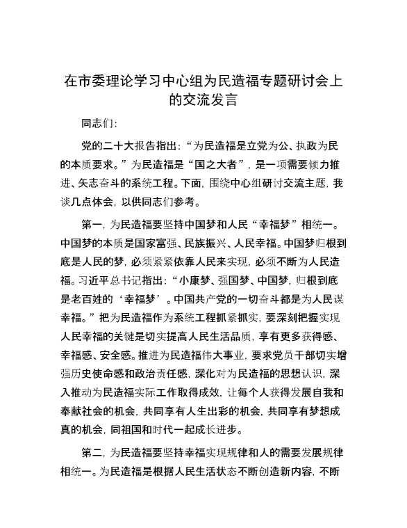 在市委理论学习中心组为民造福专题研讨会上的交流发言 2024-01-15 Word模板 99 购买前,请一定要先点击这里看看,欢迎持续关注,精彩模板每天推送 预览结束,本文件为word文档,一共4页,共1568字,请购买后,下载后查看 购买前,请一定要先点击这里看看,欢迎持续关注,精彩模板每天推送 资源下载下载价格29 RMBVIP免费升级VIP点击检测网盘有效后购买有任何充值和下载问题请加微信:xuexixuexi66 0 演讲发言