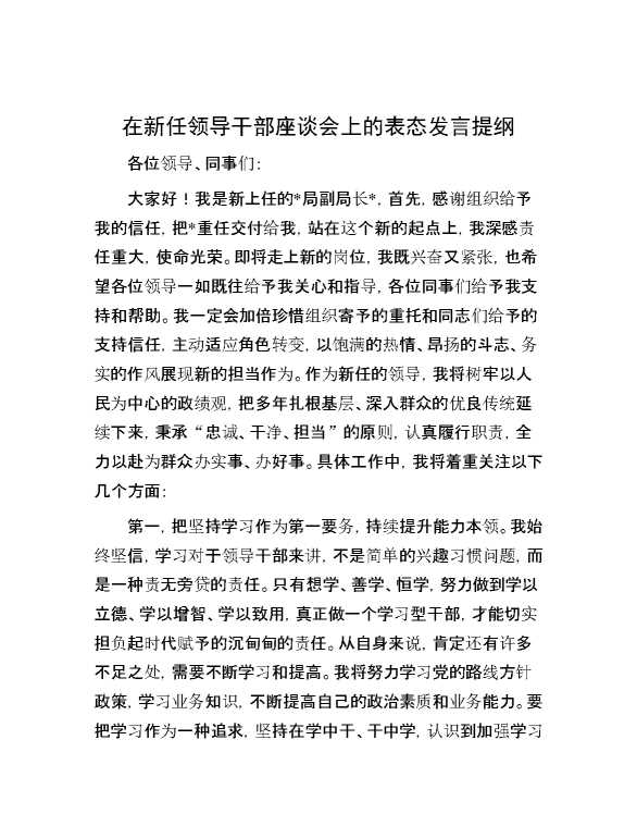 在新任领导干部座谈会上的表态发言提纲 2024-01-18 Word模板 129 购买前,请一定要先点击这里看看,欢迎持续关注,精彩模板每天推送 预览结束,本文件为word文档,一共4页,共1899字,请购买后,下载后查看 购买前,请一定要先点击这里看看,欢迎持续关注,精彩模板每天推送 资源下载下载价格29 RMBVIP免费升级VIP点击检测网盘有效后购买有任何充值和下载问题请加微信:xuexixuexi66 0 演讲发言