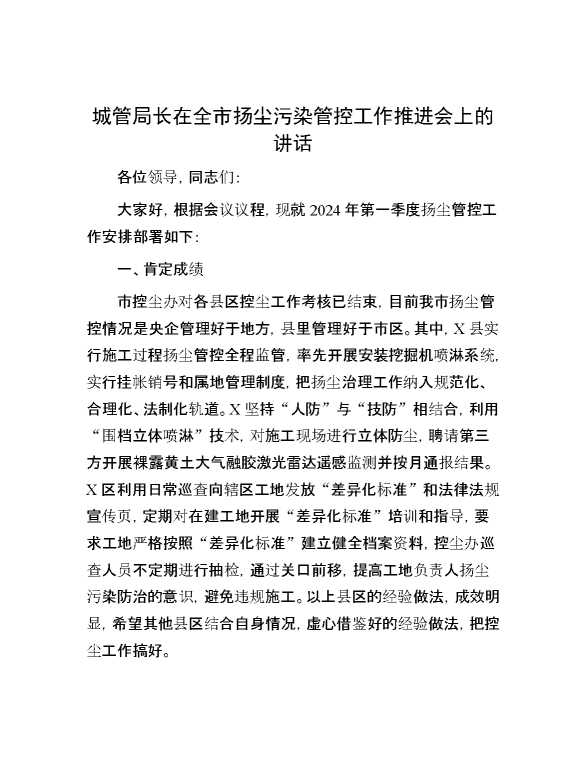 城管局长在全市扬尘污染管控工作推进会上的讲话 2024-01-18 Word模板 118 购买前,请一定要先点击这里看看,欢迎持续关注,精彩模板每天推送 预览结束,本文件为word文档,一共5页,共2189字,请购买后,下载后查看 购买前,请一定要先点击这里看看,欢迎持续关注,精彩模板每天推送 资源下载下载价格29 RMBVIP免费升级VIP点击检测网盘有效后购买有任何充值和下载问题请加微信:xuexixuexi66 0 演讲发言
