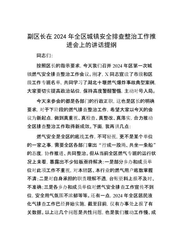 副区长在2024年全区城镇安全排查整治工作推进会上的讲话提纲 2024-01-18 Word模板 110 购买前,请一定要先点击这里看看,欢迎持续关注,精彩模板每天推送 预览结束,本文件为word文档,一共4页,共1670字,请购买后,下载后查看 购买前,请一定要先点击这里看看,欢迎持续关注,精彩模板每天推送 资源下载下载价格29 RMBVIP免费升级VIP点击检测网盘有效后购买有任何充值和下载问题请加微信:xuexixuexi66 0 演讲发言
