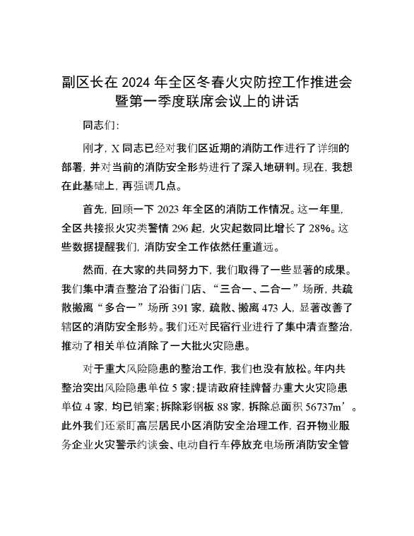 副区长在2024年全区冬春火灾防控工作推进会暨第一季度联席会议上的讲话 2024-01-18 Word模板 114 购买前,请一定要先点击这里看看,欢迎持续关注,精彩模板每天推送 预览结束,本文件为word文档,一共5页,共2103字,请购买后,下载后查看 购买前,请一定要先点击这里看看,欢迎持续关注,精彩模板每天推送 资源下载下载价格29 RMBVIP免费升级VIP点击检测网盘有效后购买有任何充值和下载问题请加微信:xuexixuexi66 0 演讲发言