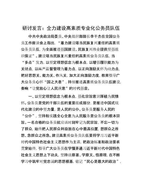 研讨发言:全力建设高素质专业化公务员队伍 2024-01-18 Word模板 157 购买前,请一定要先点击这里看看,欢迎持续关注,精彩模板每天推送 预览结束,本文件为word文档,一共4页,共1682字,请购买后,下载后查看 购买前,请一定要先点击这里看看,欢迎持续关注,精彩模板每天推送 资源下载下载价格29 RMBVIP免费升级VIP点击检测网盘有效后购买有任何充值和下载问题请加微信:xuexixuexi66 0 演讲发言