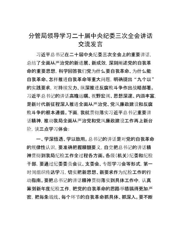 分管局领导学习二十届中央纪委三次全会讲话交流发言 2024-01-18 Word模板 122 购买前,请一定要先点击这里看看,欢迎持续关注,精彩模板每天推送 预览结束,本文件为word文档,一共3页,共979字,请购买后,下载后查看 购买前,请一定要先点击这里看看,欢迎持续关注,精彩模板每天推送 资源下载下载价格29 RMBVIP免费升级VIP点击检测网盘有效后购买有任何充值和下载问题请加微信:xuexixuexi66 0 演讲发言