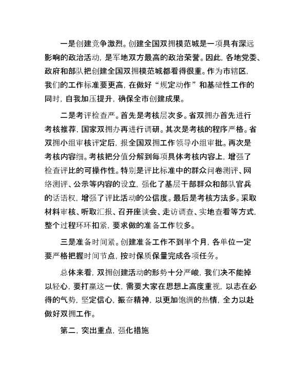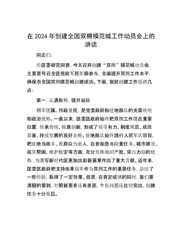 在2024年创建全国双拥模范城工作动员会上的讲话 2024-01-18 Word模板 126 购买前,请一定要先点击这里看看,欢迎持续关注,精彩模板每天推送 预览结束,本文件为word文档,一共6页,共2642字,请购买后,下载后查看 购买前,请一定要先点击这里看看,欢迎持续关注,精彩模板每天推送 资源下载下载价格29 RMBVIP免费升级VIP点击检测网盘有效后购买有任何充值和下载问题请加微信:xuexixuexi66 0 演讲发言
