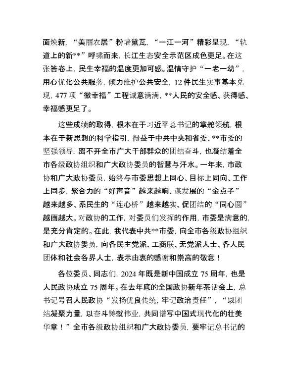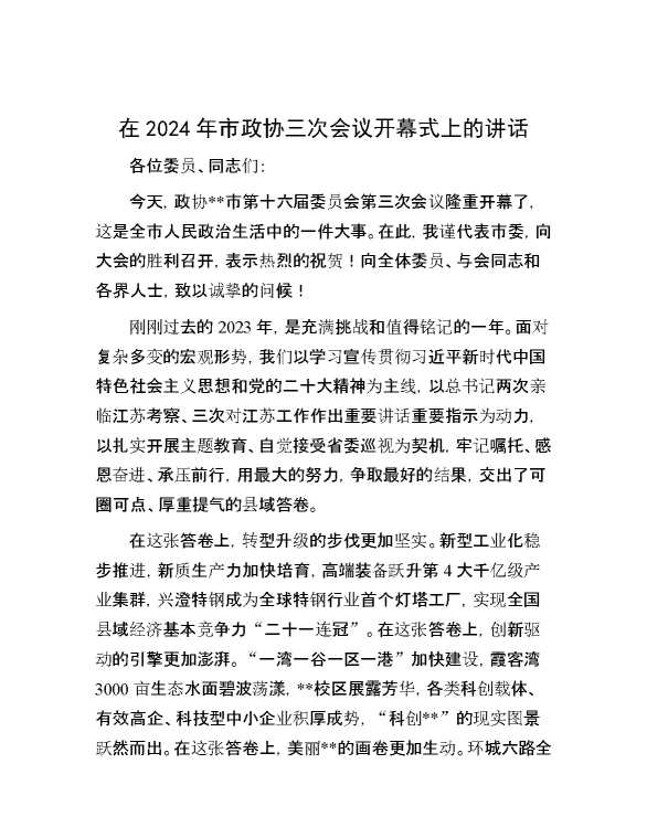 在2024年市政协三次会议开幕式上的讲话 2024-01-18 Word模板 126 购买前,请一定要先点击这里看看,欢迎持续关注,精彩模板每天推送 预览结束,本文件为word文档,一共6页,共2539字,请购买后,下载后查看 购买前,请一定要先点击这里看看,欢迎持续关注,精彩模板每天推送 资源下载下载价格29 RMBVIP免费升级VIP点击检测网盘有效后购买有任何充值和下载问题请加微信:xuexixuexi66 0 演讲发言