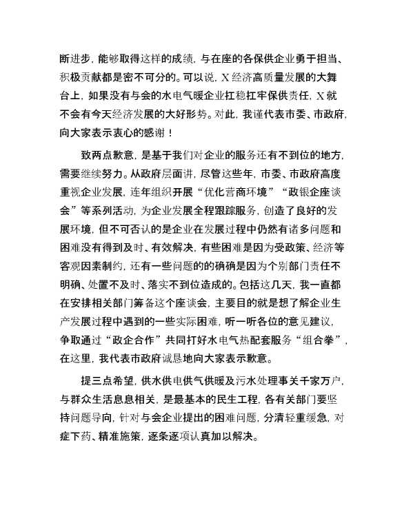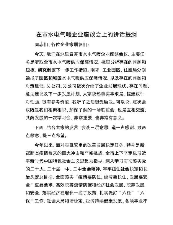 在市水电气暖企业座谈会上的讲话提纲 2024-01-18 Word模板 135 购买前,请一定要先点击这里看看,欢迎持续关注,精彩模板每天推送 预览结束,本文件为word文档,一共4页,共1537字,请购买后,下载后查看 购买前,请一定要先点击这里看看,欢迎持续关注,精彩模板每天推送 资源下载下载价格29 RMBVIP免费升级VIP点击检测网盘有效后购买有任何充值和下载问题请加微信:xuexixuexi66 0 演讲发言