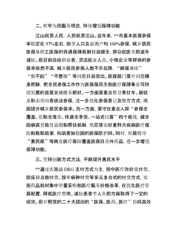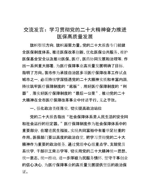 交流发言:学习贯彻党的二十大精神 奋力推进医保高质量发展 2024-01-18 Word模板 131 购买前,请一定要先点击这里看看,欢迎持续关注,精彩模板每天推送 预览结束,本文件为word文档,一共4页,共1956字,请购买后,下载后查看 购买前,请一定要先点击这里看看,欢迎持续关注,精彩模板每天推送 资源下载下载价格29 RMBVIP免费升级VIP点击检测网盘有效后购买有任何充值和下载问题请加微信:xuexixuexi66 0 演讲发言