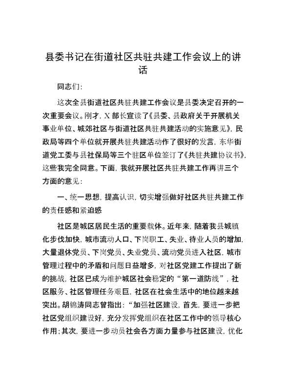 县委书记在街道社区共驻共建工作会议上的讲话 2024-01-18 Word模板 119 购买前,请一定要先点击这里看看,欢迎持续关注,精彩模板每天推送 预览结束,本文件为word文档,一共9页,共4554字,请购买后,下载后查看 购买前,请一定要先点击这里看看,欢迎持续关注,精彩模板每天推送 资源下载下载价格29 RMBVIP免费升级VIP点击检测网盘有效后购买有任何充值和下载问题请加微信:xuexixuexi66 0 演讲发言