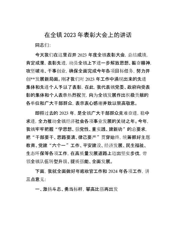 在全镇2023年表彰大会上的讲话 2024-01-18 Word模板 102 购买前,请一定要先点击这里看看,欢迎持续关注,精彩模板每天推送 预览结束,本文件为word文档,一共4页,共1897字,请购买后,下载后查看 购买前,请一定要先点击这里看看,欢迎持续关注,精彩模板每天推送 资源下载下载价格29 RMBVIP免费升级VIP点击检测网盘有效后购买有任何充值和下载问题请加微信:xuexixuexi66 0 演讲发言