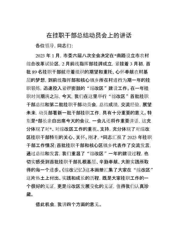 在挂职干部总结动员会上的讲话 2024-02-19 Word模板 114 购买前,请一定要先点击这里看看,欢迎持续关注,精彩模板每天推送 预览结束,本文件为word文档,一共7页,共3588字,请购买后,下载后查看 购买前,请一定要先点击这里看看,欢迎持续关注,精彩模板每天推送 资源下载下载价格29 RMBVIP免费升级VIP点击检测网盘有效后购买有任何充值和下载问题请加微信:xuexixuexi66 0 演讲发言