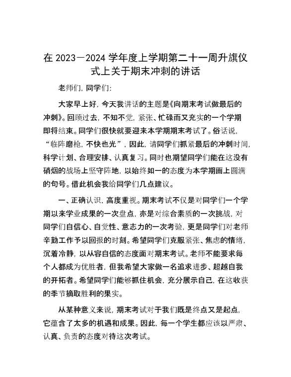 在2023-2024学年度上学期第二十一周升旗仪式上关于期末冲刺的讲话 2024-02-19 Word模板 109 购买前,请一定要先点击这里看看,欢迎持续关注,精彩模板每天推送 预览结束,本文件为word文档,一共3页,共1145字,请购买后,下载后查看 购买前,请一定要先点击这里看看,欢迎持续关注,精彩模板每天推送 资源下载下载价格29 RMBVIP免费升级VIP点击检测网盘有效后购买有任何充值和下载问题请加微信:xuexixuexi66 0 演讲发言