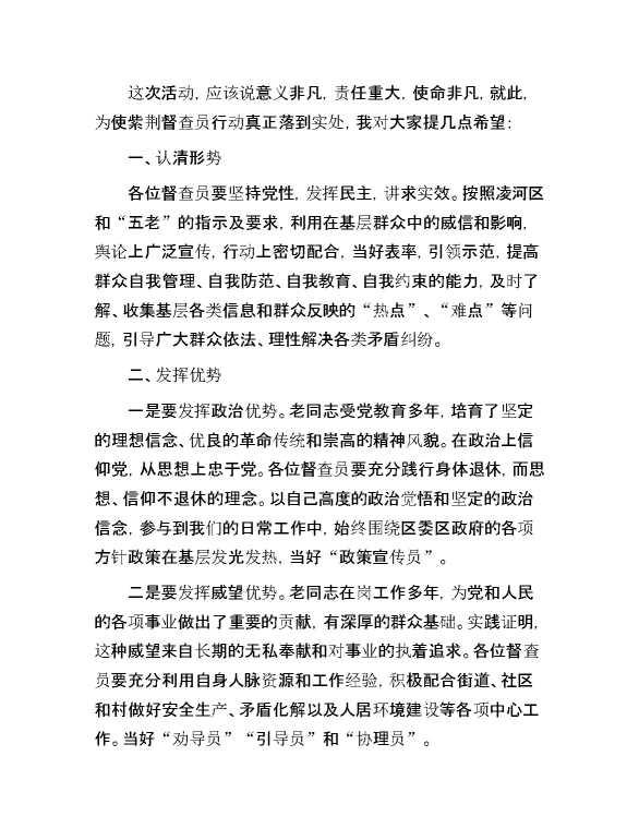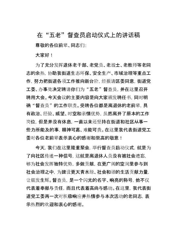 在“五老”督查员启动仪式上的讲话稿 2024-02-19 Word模板 109 购买前,请一定要先点击这里看看,欢迎持续关注,精彩模板每天推送 预览结束,本文件为word文档,一共4页,共1835字,请购买后,下载后查看 购买前,请一定要先点击这里看看,欢迎持续关注,精彩模板每天推送 资源下载下载价格29 RMBVIP免费升级VIP点击检测网盘有效后购买有任何充值和下载问题请加微信:xuexixuexi66 0 演讲发言