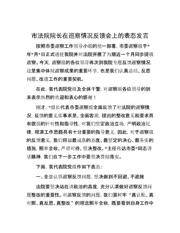市法院院长在巡察情况反馈会上的表态发言 2024-02-28 Word模板 104 购买前,请一定要先点击这里看看,欢迎持续关注,精彩模板每天推送 预览结束,本文件为word文档,一共4页,共1584字,请购买后,下载后查看 购买前,请一定要先点击这里看看,欢迎持续关注,精彩模板每天推送 资源下载下载价格29 RMBVIP免费升级VIP点击检测网盘有效后购买有任何充值和下载问题请加微信:xuexixuexi66 0 演讲发言