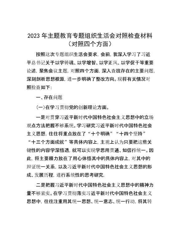 2023年主题教育专题组织生活会对照检查材料(对照四个方面) 2024-02-28 Word模板 98 购买前,请一定要先点击这里看看,欢迎持续关注,精彩模板每天推送 预览结束,本文件为word文档,一共9页,共4150字,请购买后,下载后查看 购买前,请一定要先点击这里看看,欢迎持续关注,精彩模板每天推送 资源下载下载价格29 RMBVIP免费升级VIP点击检测网盘有效后购买有任何充值和下载问题请加微信:xuexixuexi66 0 党课及生活会