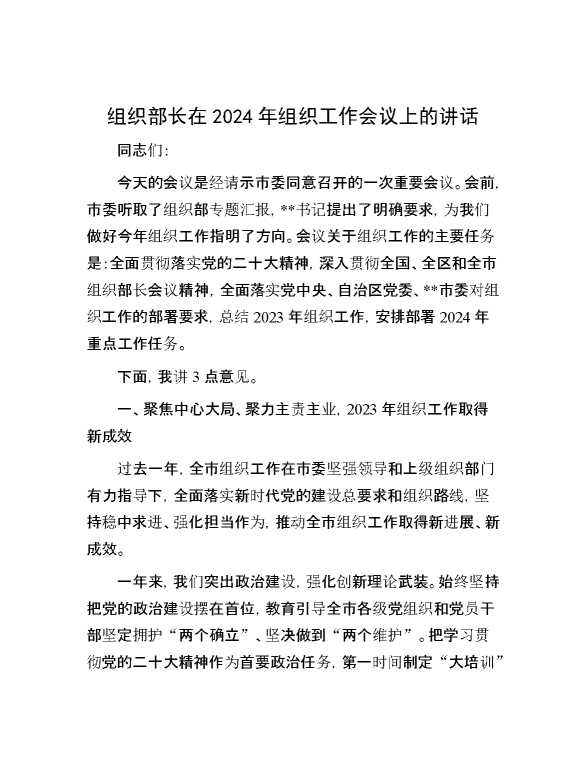 组织部长在2024年组织工作会议上的讲话 2024-03-04 Word模板 103 购买前,请一定要先点击这里看看,欢迎持续关注,精彩模板每天推送 预览结束,本文件为word文档,一共21页,共10058字,请购买后,下载后查看 购买前,请一定要先点击这里看看,欢迎持续关注,精彩模板每天推送 资源下载下载价格29 RMBVIP免费升级VIP点击检测网盘有效后购买有任何充值和下载问题请加微信:xuexixuexi66 0 演讲发言