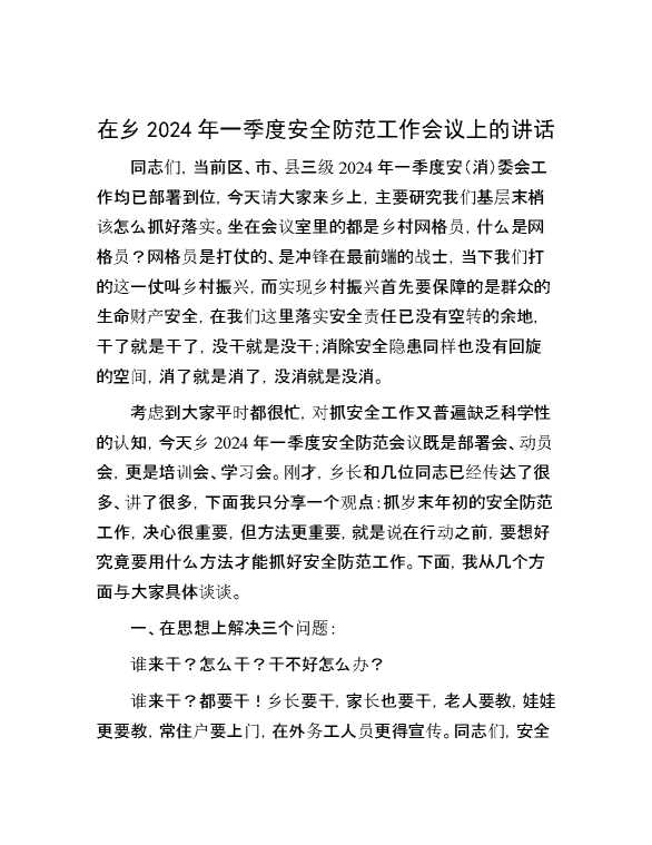 在乡2024年一季度安全防范工作会议上的讲话 2024-03-04 Word模板 97 购买前,请一定要先点击这里看看,欢迎持续关注,精彩模板每天推送 预览结束,本文件为word文档,一共4页,共1921字,请购买后,下载后查看 购买前,请一定要先点击这里看看,欢迎持续关注,精彩模板每天推送 资源下载下载价格29 RMBVIP免费升级VIP点击检测网盘有效后购买有任何充值和下载问题请加微信:xuexixuexi66 0 演讲发言