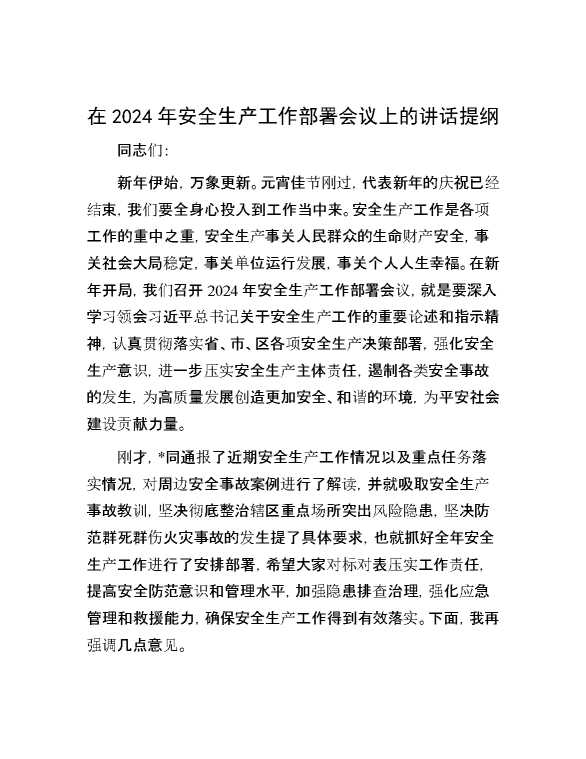 在2024年安全生产工作部署会议上的讲话提纲 2024-03-04 Word模板 95 购买前,请一定要先点击这里看看,欢迎持续关注,精彩模板每天推送 预览结束,本文件为word文档,一共6页,共3017字,请购买后,下载后查看 购买前,请一定要先点击这里看看,欢迎持续关注,精彩模板每天推送 资源下载下载价格29 RMBVIP免费升级VIP点击检测网盘有效后购买有任何充值和下载问题请加微信:xuexixuexi66 0 演讲发言