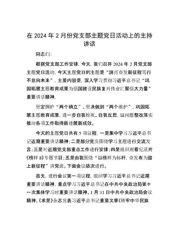 在2024年2月份党支部主题党日活动上的主持讲话 2024-03-04 Word模板 94 购买前,请一定要先点击这里看看,欢迎持续关注,精彩模板每天推送 预览结束,本文件为word文档,一共8页,共3566字,请购买后,下载后查看 购买前,请一定要先点击这里看看,欢迎持续关注,精彩模板每天推送 资源下载下载价格29 RMBVIP免费升级VIP点击检测网盘有效后购买有任何充值和下载问题请加微信:xuexixuexi66 0 演讲发言