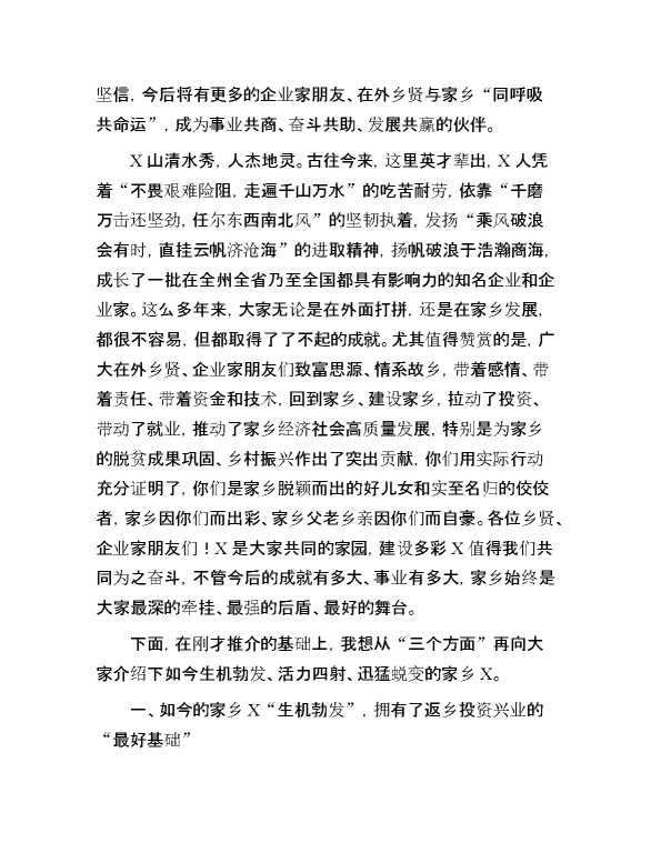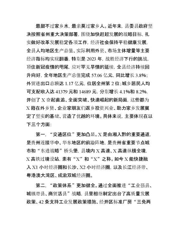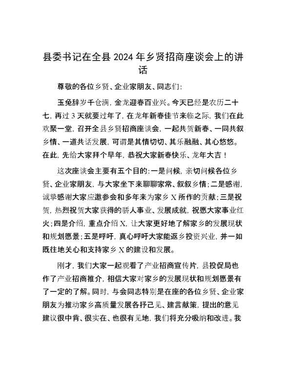 县委书记在全县2024年乡贤招商座谈会上的讲话 2024-03-04 Word模板 98 购买前,请一定要先点击这里看看,欢迎持续关注,精彩模板每天推送 预览结束,本文件为word文档,一共8页,共3797字,请购买后,下载后查看 购买前,请一定要先点击这里看看,欢迎持续关注,精彩模板每天推送 资源下载下载价格29 RMBVIP免费升级VIP点击检测网盘有效后购买有任何充值和下载问题请加微信:xuexixuexi66 0 演讲发言