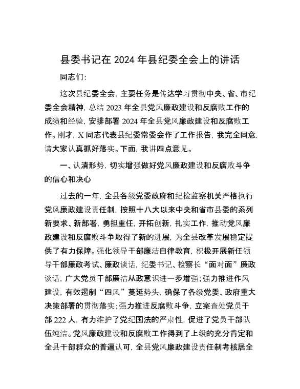 县委书记在2024年县纪委全会上的讲话 2024-03-04 Word模板 98 购买前,请一定要先点击这里看看,欢迎持续关注,精彩模板每天推送 预览结束,本文件为word文档,一共11页,共5512字,请购买后,下载后查看 购买前,请一定要先点击这里看看,欢迎持续关注,精彩模板每天推送 资源下载下载价格29 RMBVIP免费升级VIP点击检测网盘有效后购买有任何充值和下载问题请加微信:xuexixuexi66 0 演讲发言