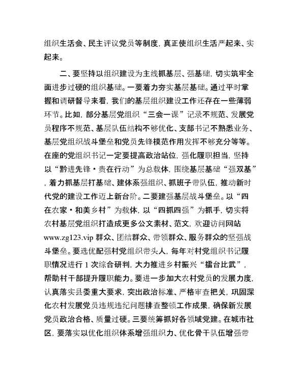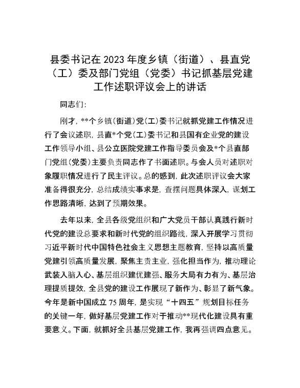 县委书记在2023年度乡镇(街道)、县直党(工)委及部门党组(党委)书记抓基层党建工作述职评议会上的讲话 2024-03-04 Word模板 100 购买前,请一定要先点击这里看看,欢迎持续关注,精彩模板每天推送 预览结束,本文件为word文档,一共8页,共3673字,请购买后,下载后查看 购买前,请一定要先点击这里看看,欢迎持续关注,精彩模板每天推送 资源下载下载价格29 RMBVIP免费升级VIP点击检测网盘有效后购买有任何充值和下载问题请加微信:xuexixuexi66 0 演讲发言