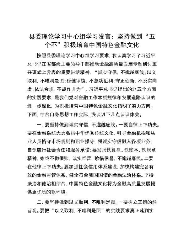 县委理论学习中心组学习发言:坚持做到“五个不” 积极培育中国特色金融文化 2024-03-04 Word模板 94 购买前,请一定要先点击这里看看,欢迎持续关注,精彩模板每天推送 预览结束,本文件为word文档,一共3页,共1425字,请购买后,下载后查看 购买前,请一定要先点击这里看看,欢迎持续关注,精彩模板每天推送 资源下载下载价格29 RMBVIP免费升级VIP立即购买有任何充值和下载问题请加微信:xuexixuexi66 0 演讲发言