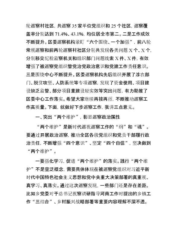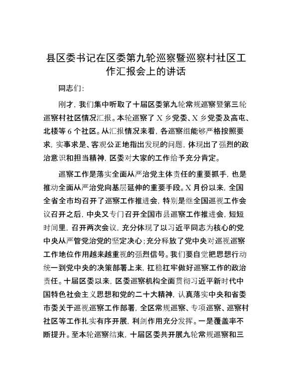 县区委书记在区委第九轮巡察暨巡察村社区工作汇报会上的讲话 2024-03-04 Word模板 95 购买前,请一定要先点击这里看看,欢迎持续关注,精彩模板每天推送 预览结束,本文件为word文档,一共7页,共3332字,请购买后,下载后查看 购买前,请一定要先点击这里看看,欢迎持续关注,精彩模板每天推送 资源下载下载价格29 RMBVIP免费升级VIP点击检测网盘有效后购买有任何充值和下载问题请加微信:xuexixuexi66 0 演讲发言