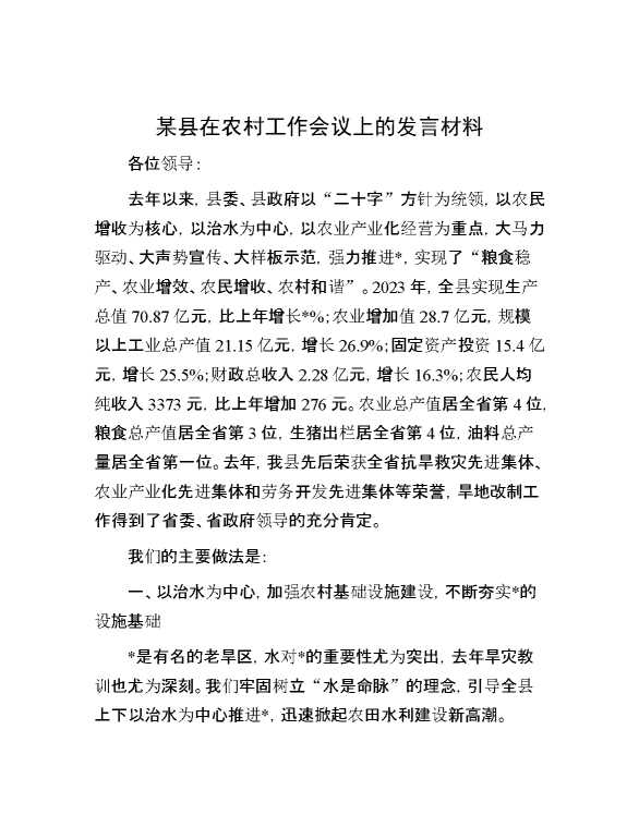 某县在农村工作会议上的发言材料 2024-03-04 Word模板 94 购买前,请一定要先点击这里看看,欢迎持续关注,精彩模板每天推送 预览结束,本文件为word文档,一共9页,共4294字,请购买后,下载后查看 购买前,请一定要先点击这里看看,欢迎持续关注,精彩模板每天推送 资源下载下载价格29 RMBVIP免费升级VIP点击检测网盘有效后购买有任何充值和下载问题请加微信:xuexixuexi66 0 演讲发言