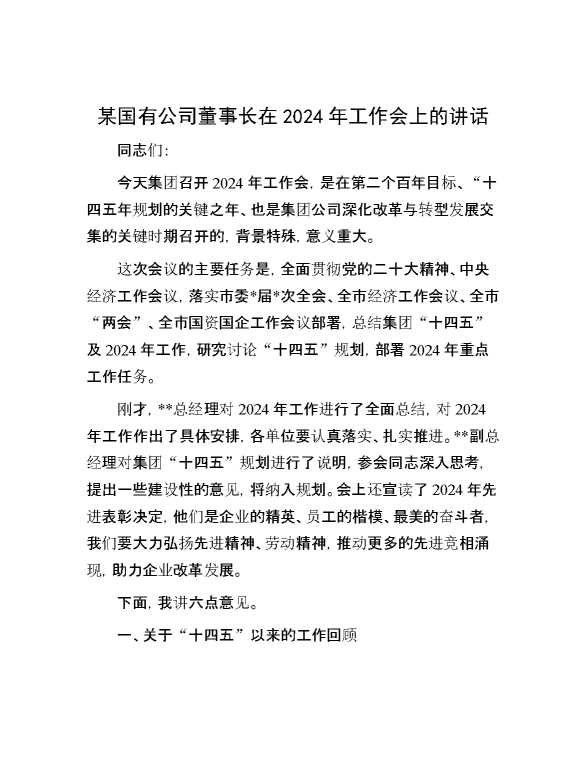 某国有公司董事长在2024年工作会上的讲话 2024-03-04 Word模板 100 购买前,请一定要先点击这里看看,欢迎持续关注,精彩模板每天推送 预览结束,本文件为word文档,一共15页,共6566字,请购买后,下载后查看 购买前,请一定要先点击这里看看,欢迎持续关注,精彩模板每天推送 资源下载下载价格29 RMBVIP免费升级VIP点击检测网盘有效后购买有任何充值和下载问题请加微信:xuexixuexi66 0 演讲发言