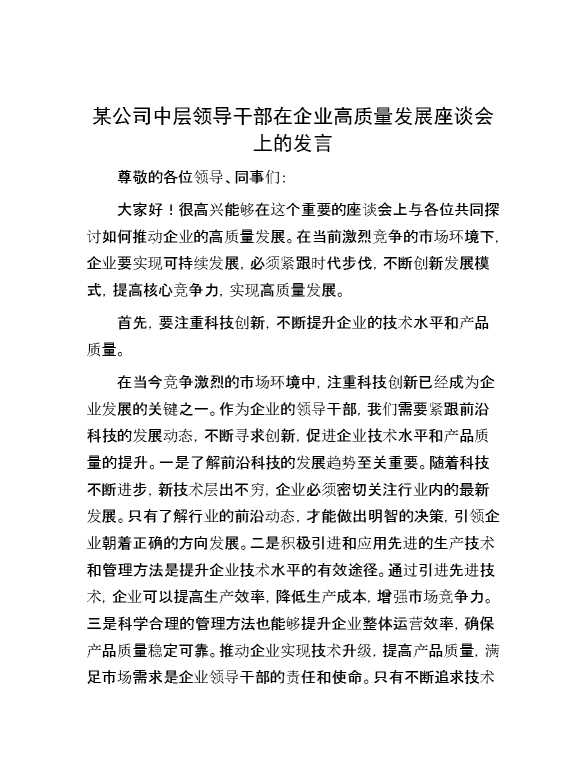 某公司中层领导干部在企业高质量发展座谈会上的发言 2024-03-04 Word模板 95 购买前,请一定要先点击这里看看,欢迎持续关注,精彩模板每天推送 预览结束,本文件为word文档,一共5页,共2288字,请购买后,下载后查看 购买前,请一定要先点击这里看看,欢迎持续关注,精彩模板每天推送 资源下载下载价格29 RMBVIP免费升级VIP点击检测网盘有效后购买有任何充值和下载问题请加微信:xuexixuexi66 0 演讲发言