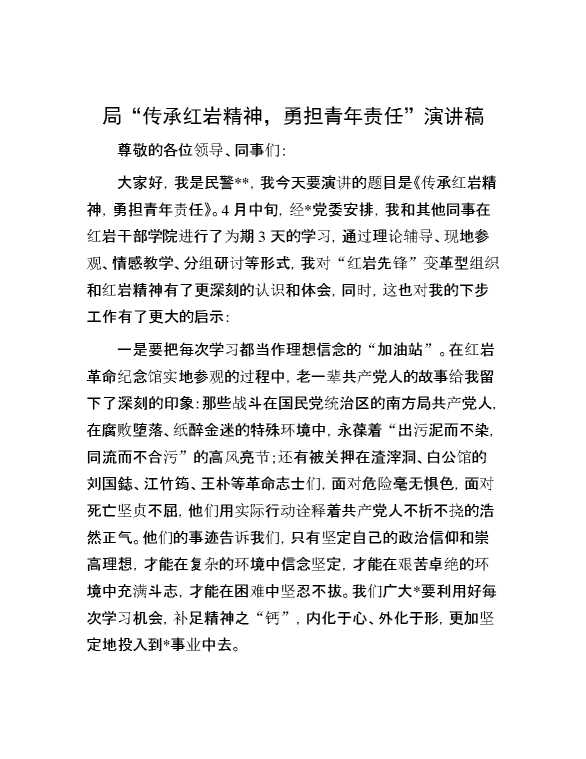 局“传承红岩精神,勇担青年责任”演讲稿 2024-03-04 Word模板 104 购买前,请一定要先点击这里看看,欢迎持续关注,精彩模板每天推送 预览结束,本文件为word文档,一共3页,共1173字,请购买后,下载后查看 购买前,请一定要先点击这里看看,欢迎持续关注,精彩模板每天推送 资源下载下载价格29 RMBVIP免费升级VIP点击检测网盘有效后购买有任何充值和下载问题请加微信:xuexixuexi66 0 演讲发言