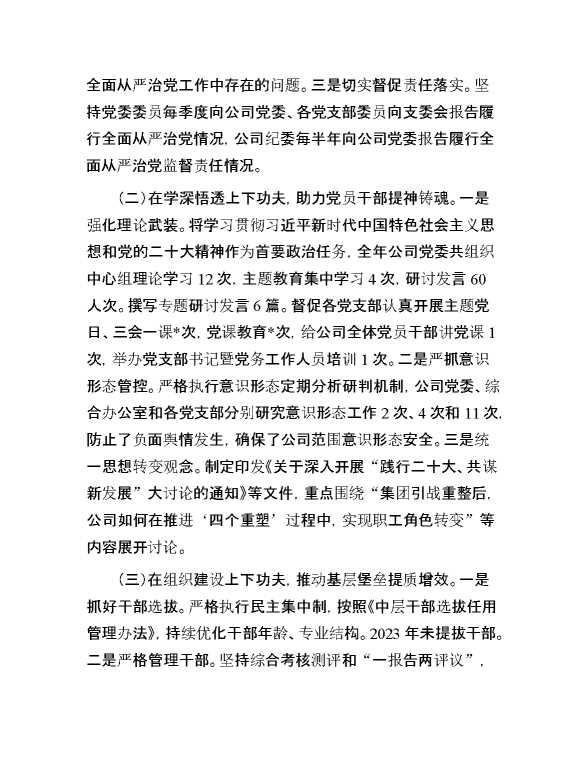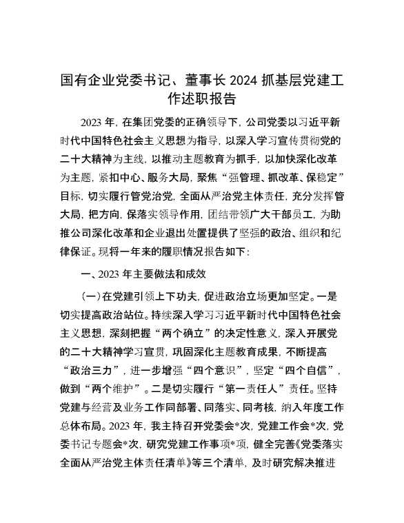 国有企业党委书记、董事长2024抓基层党建工作述职报告 2024-03-06 Word模板 129 购买前,请一定要先点击这里看看,欢迎持续关注,精彩模板每天推送 预览结束,本文件为word文档,一共6页,共2751字,请购买后,下载后查看 购买前,请一定要先点击这里看看,欢迎持续关注,精彩模板每天推送 资源下载下载价格29 RMBVIP免费升级VIP点击检测网盘有效后购买有任何充值和下载问题请加微信:xuexixuexi66 0 总结汇报