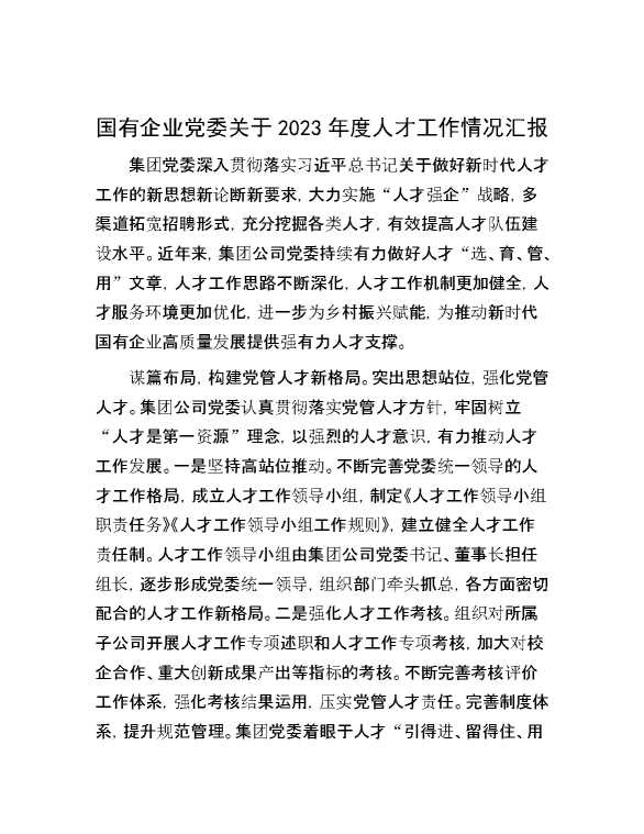 国有企业党委关于2023年度人才工作情况汇报 2024-03-06 Word模板 118 购买前,请一定要先点击这里看看,欢迎持续关注,精彩模板每天推送 预览结束,本文件为word文档,一共5页,共2397字,请购买后,下载后查看 购买前,请一定要先点击这里看看,欢迎持续关注,精彩模板每天推送 资源下载下载价格29 RMBVIP免费升级VIP点击检测网盘有效后购买有任何充值和下载问题请加微信:xuexixuexi66 0 总结汇报