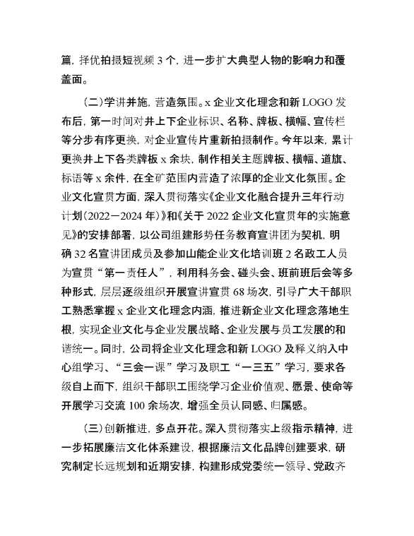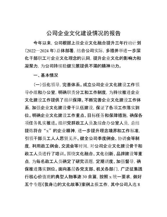 公司企业文化建设情况的报告 2024-03-06 Word模板 126 购买前,请一定要先点击这里看看,欢迎持续关注,精彩模板每天推送 预览结束,本文件为word文档,一共6页,共3026字,请购买后,下载后查看 购买前,请一定要先点击这里看看,欢迎持续关注,精彩模板每天推送 资源下载下载价格29 RMBVIP免费升级VIP点击检测网盘有效后购买有任何充值和下载问题请加微信:xuexixuexi66 0 总结汇报