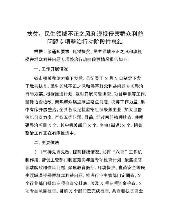 扶贫、民生领域不正之风和漠视侵害群众利益问题专项整治行动阶段性总结 2024-03-06 Word模板 118 购买前,请一定要先点击这里看看,欢迎持续关注,精彩模板每天推送 预览结束,本文件为word文档,一共4页,共1736字,请购买后,下载后查看 购买前,请一定要先点击这里看看,欢迎持续关注,精彩模板每天推送 资源下载下载价格29 RMBVIP免费升级VIP点击检测网盘有效后购买有任何充值和下载问题请加微信:xuexixuexi66 0 总结汇报