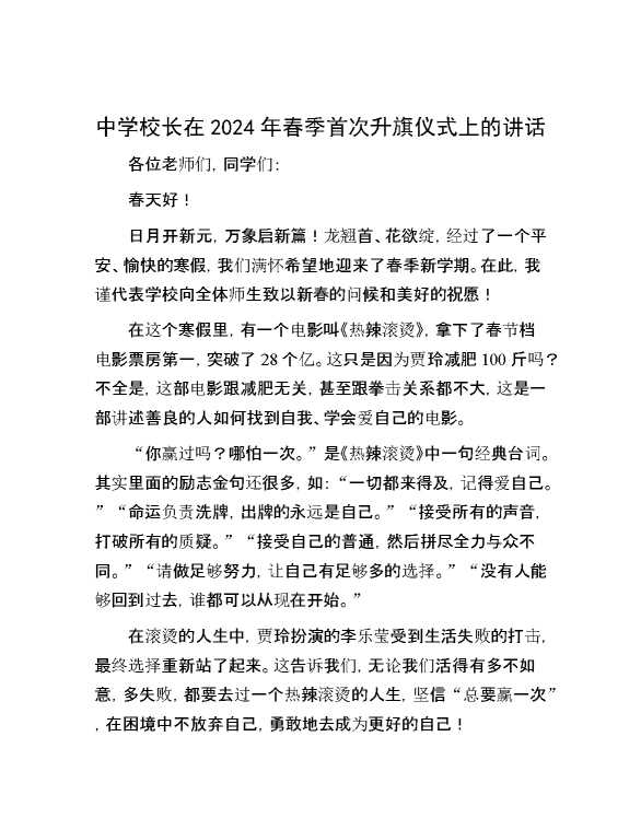 中学校长在2024年春季首次升旗仪式上的讲话 2024-03-06 Word模板 101 购买前,请一定要先点击这里看看,欢迎持续关注,精彩模板每天推送 预览结束,本文件为word文档,一共5页,共2055字,请购买后,下载后查看 购买前,请一定要先点击这里看看,欢迎持续关注,精彩模板每天推送 资源下载下载价格29 RMBVIP免费升级VIP点击检测网盘有效后购买有任何充值和下载问题请加微信:xuexixuexi66 0 演讲发言