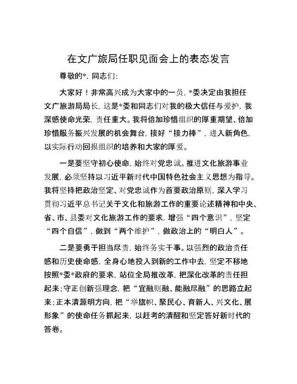 在文广旅局任职见面会上的表态发言 2024-03-06 Word模板 116 购买前,请一定要先点击这里看看,欢迎持续关注,精彩模板每天推送 预览结束,本文件为word文档,一共2页,共755字,请购买后,下载后查看 购买前,请一定要先点击这里看看,欢迎持续关注,精彩模板每天推送 资源下载下载价格29 RMBVIP免费升级VIP点击检测网盘有效后购买有任何充值和下载问题请加微信:xuexixuexi66 0 演讲发言