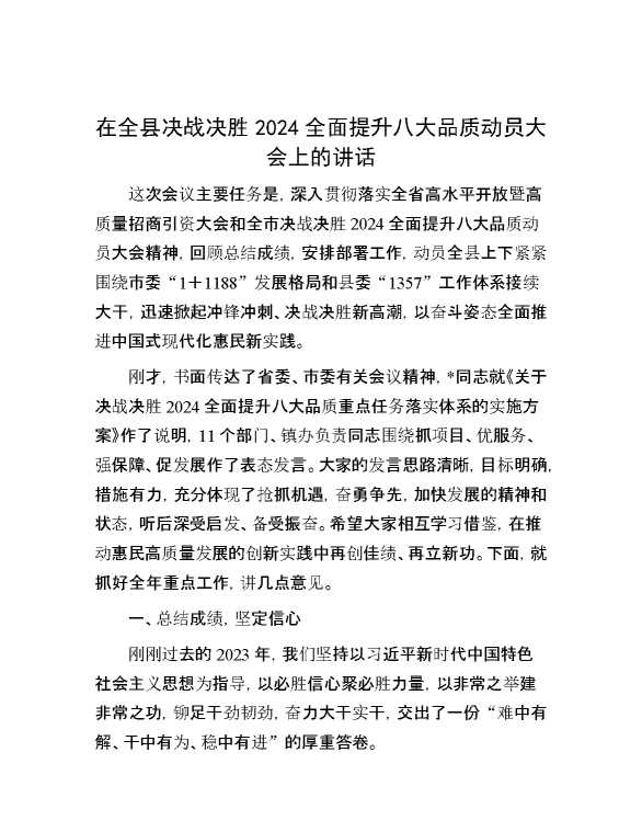 在全县决战决胜2024全面提升八大品质动员大会上的讲话 2024-03-06 Word模板 111 购买前,请一定要先点击这里看看,欢迎持续关注,精彩模板每天推送 预览结束,本文件为word文档,一共13页,共6484字,请购买后,下载后查看 购买前,请一定要先点击这里看看,欢迎持续关注,精彩模板每天推送 资源下载下载价格29 RMBVIP免费升级VIP点击检测网盘有效后购买有任何充值和下载问题请加微信:xuexixuexi66 0 演讲发言