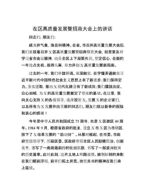 在区高质量发展暨招商大会上的讲话 2024-03-06 Word模板 114 购买前,请一定要先点击这里看看,欢迎持续关注,精彩模板每天推送 预览结束,本文件为word文档,一共12页,共5757字,请购买后,下载后查看 购买前,请一定要先点击这里看看,欢迎持续关注,精彩模板每天推送 资源下载下载价格29 RMBVIP免费升级VIP点击检测网盘有效后购买有任何充值和下载问题请加微信:xuexixuexi66 0 演讲发言