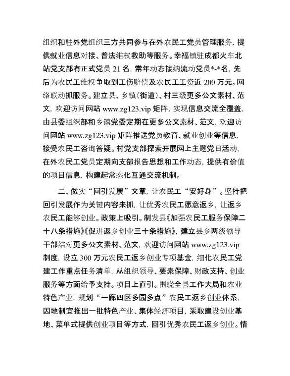党建情况汇报:做实“三篇”文章 抓实农民工党建 2024-03-10 Word模板 151 购买前,请一定要先点击这里看看,欢迎持续关注,精彩模板每天推送 预览结束,本文件为word文档,一共5页,共2420字,请购买后,下载后查看 购买前,请一定要先点击这里看看,欢迎持续关注,精彩模板每天推送 资源下载下载价格29 RMBVIP免费升级VIP点击检测网盘有效后购买有任何充值和下载问题请加微信:xuexixuexi66 0 总结汇报