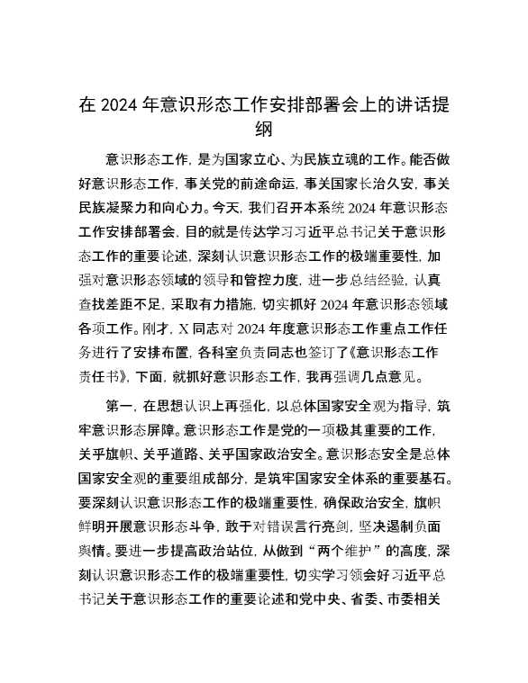 在2024年意识形态工作安排部署会上的讲话提纲 2024-03-10 Word模板 110 购买前,请一定要先点击这里看看,欢迎持续关注,精彩模板每天推送 预览结束,本文件为word文档,一共5页,共2202字,请购买后,下载后查看 购买前,请一定要先点击这里看看,欢迎持续关注,精彩模板每天推送 资源下载下载价格29 RMBVIP免费升级VIP点击检测网盘有效后购买有任何充值和下载问题请加微信:xuexixuexi66 0 演讲发言