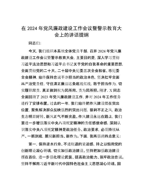 在2024年党风廉政建设工作会议暨警示教育大会上的讲话提纲 2024-03-10 Word模板 127 购买前,请一定要先点击这里看看,欢迎持续关注,精彩模板每天推送 预览结束,本文件为word文档,一共5页,共2518字,请购买后,下载后查看 购买前,请一定要先点击这里看看,欢迎持续关注,精彩模板每天推送 资源下载下载价格29 RMBVIP免费升级VIP点击检测网盘有效后购买有任何充值和下载问题请加微信:xuexixuexi66 0 演讲发言